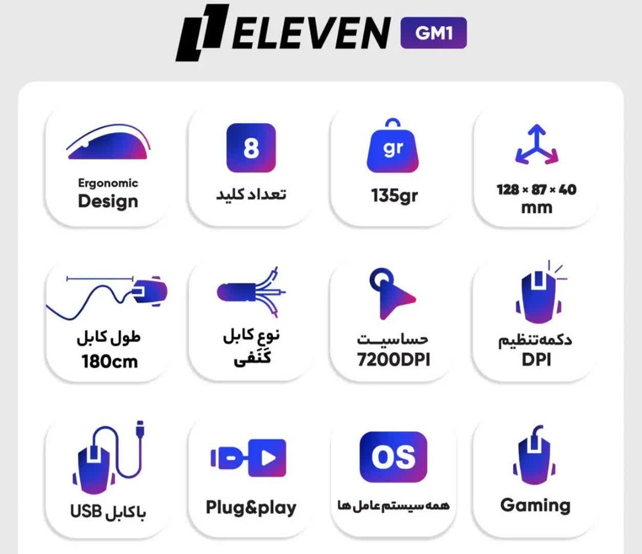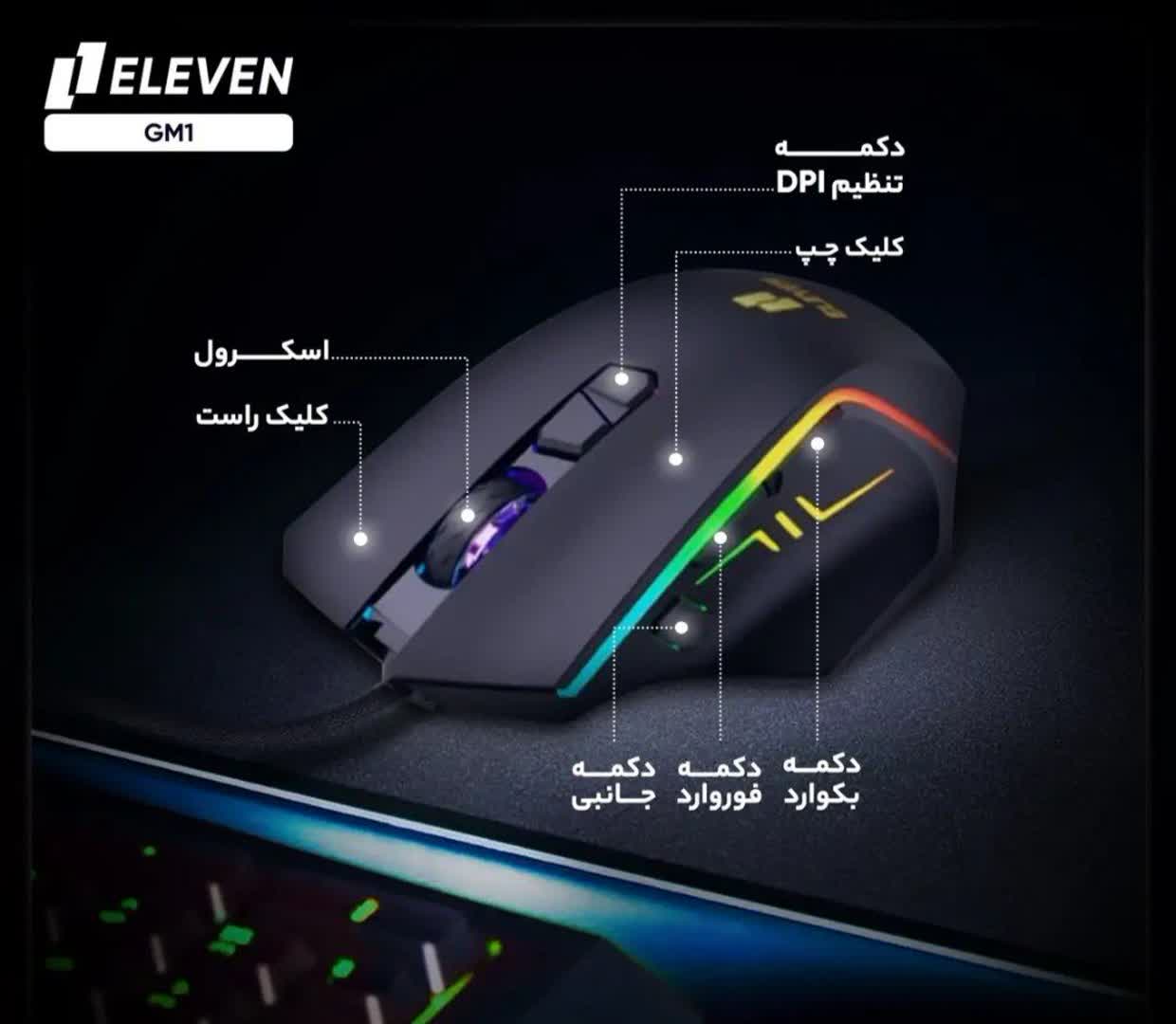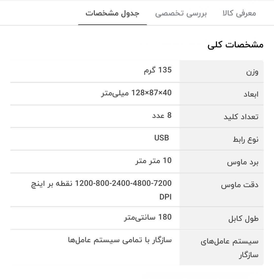 قابلیت برنامه ریزی و شخصی سازی با برنامه تعداد کلید هشت عدد افکت نوری مختلف با قابلیت عوض کردن توسط برنامه حساسیت تا 7200 DPI بدنه موس جیر وزن ۱۵۰ گرم کابل کنفی یک و هشت دهم متری عمر کلیدها تا سه میلیون کلیک